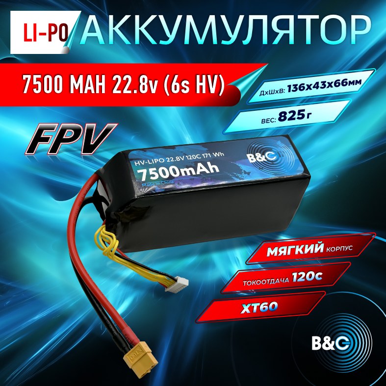 Аккумулятор Lipo B&C 7500 MAH 22.8v (6s HV), 120С, XT60, Softcase B&C-7500-6SHV-120-S-XT60