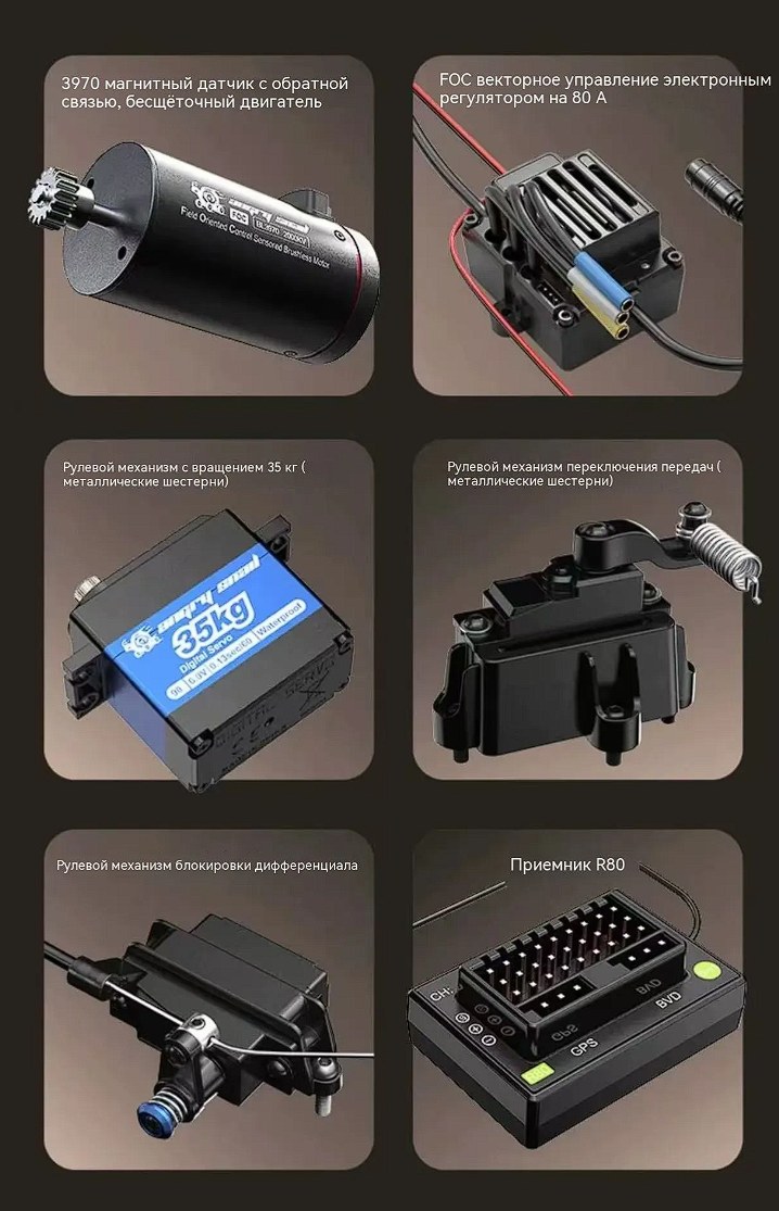 Модель оснащена мотором 3970 с системой FOC-векторного управления и регулятором 80A ESC. Это обеспечивает плавную тягу, точный контроль и стабильную работу даже на сложных участках.