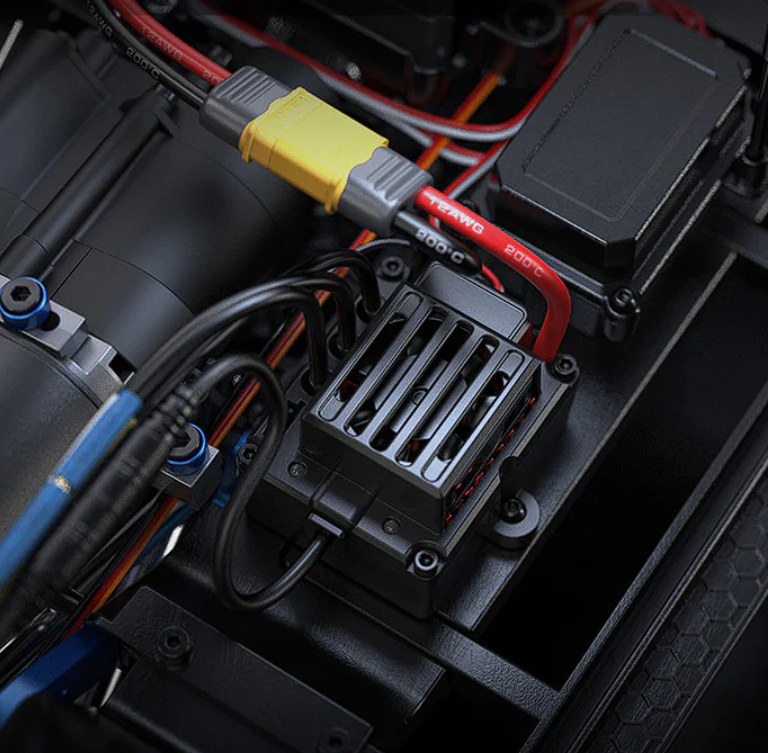 Модель оснащена сенсорным бесколлекторным мотором 3970 и регулятором 80A FOC ESC, который обеспечивает: